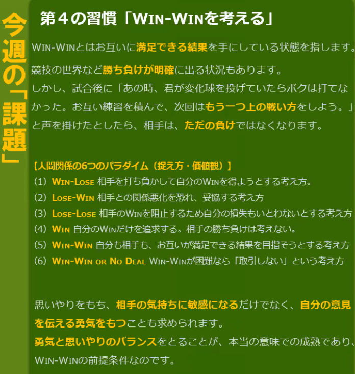 今日は「 win-win を考える 」 を学びました。